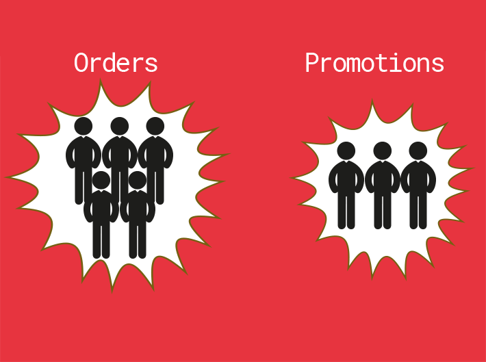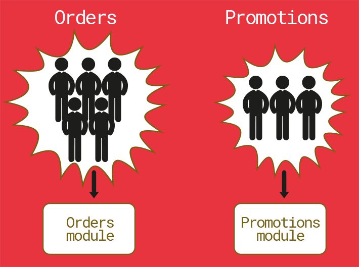 Let's say that Orders and Promotions are two areas of responsibility our software product needs to meet. An intuitive thing to do would be to create a team structure that reflects these areas – Team Orders and Team Promotions.
