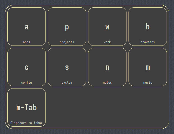 I now have a great code editor setup and an awesome hardware setup. So what’s left to be done? The operating system controls of course. What I now wanted to achieve was the same amount of customizability as with Neovim’s options. I was especially fond of the chorded keypresses which could get me anywhere in a few clicks while being extremely flexible. With that in mind, I came up with an idea to translate that to the OS level. I tried to find a piece of software that would allow me to realize it, but unfortunately, it was nowhere to be found. The only logical solution was to create my own.
