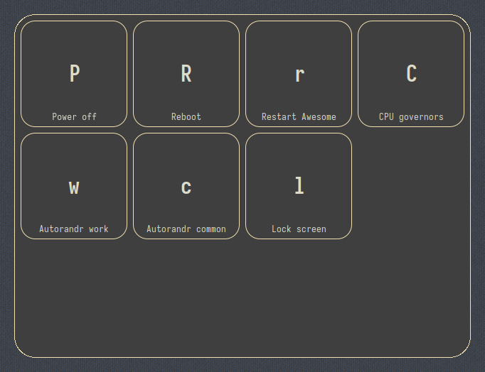 Each window shows currently available keypresses to get to other sections or run some scripts. So for instance, after I press the “s” key some “system” options like rebooting, locking screen, or setting the CPU power profile are displayed. And so for example the “Super-Tab s l” chord locks my screen.
